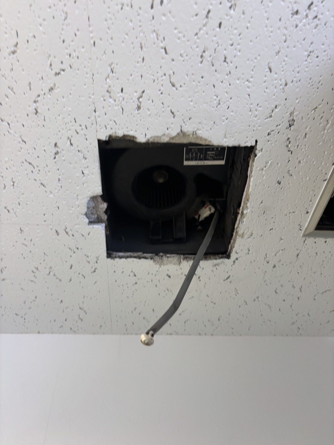 原因を確認しつつ、既存の換気扇を取り外し配線やダクトの状態もチェックしながら安心第一で新しい機器の取り付けを進めます。