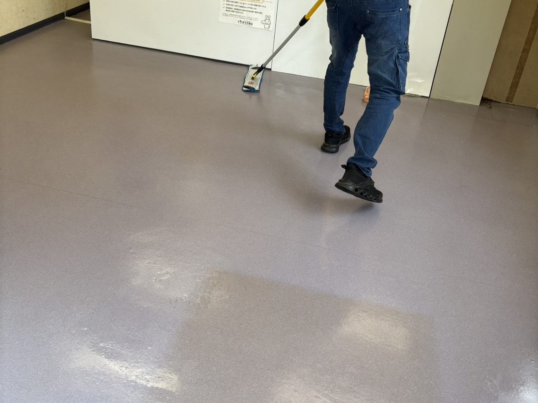 床のゴミなどを取り除いた後、剥離剤を塗布して古いワックスを浮かせていきます。